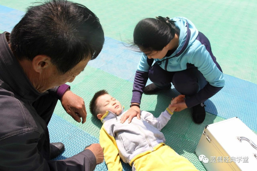 到达户外指定安全地点,校医对受伤幼儿实施抢救工作