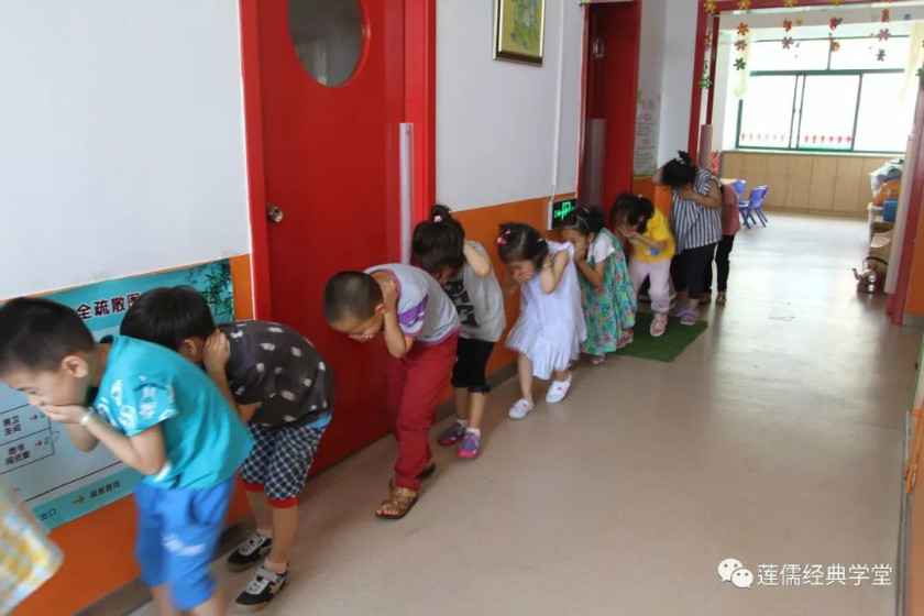 孩子们在老师紧张有序的组织下用手捂住口鼻,弯着身子按照指定路线,快速有序的撤离“火灾现场”,到达指定安全场地。
