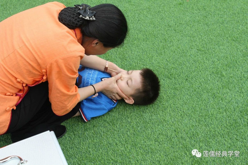 到达户外指定安全地点,校医对受伤幼儿实施抢救工作。