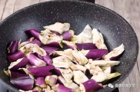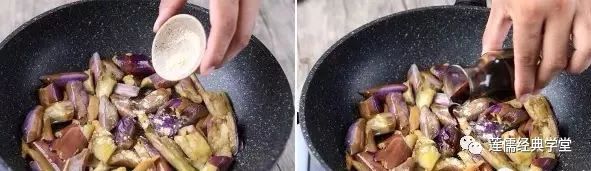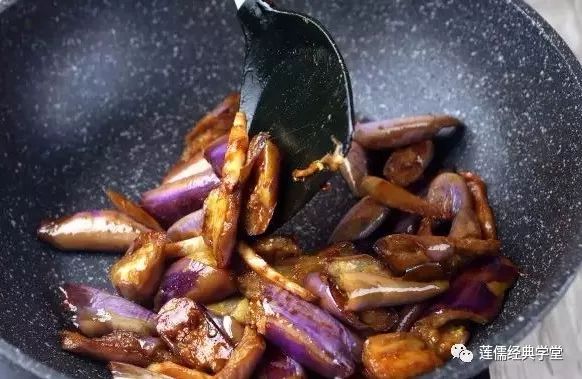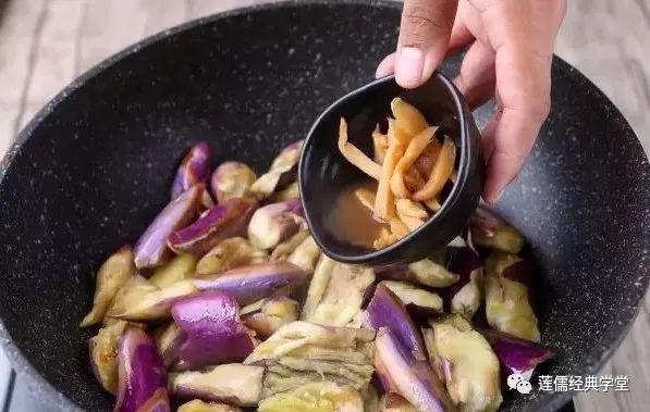 ③茄子煎断生后放入泡姜,继续煸炒,泡姜的汤汁被茄子吸收,会别有一番滋味!