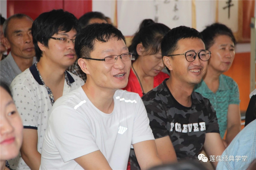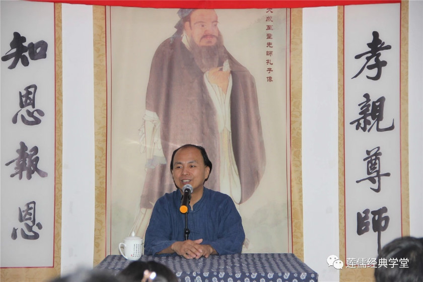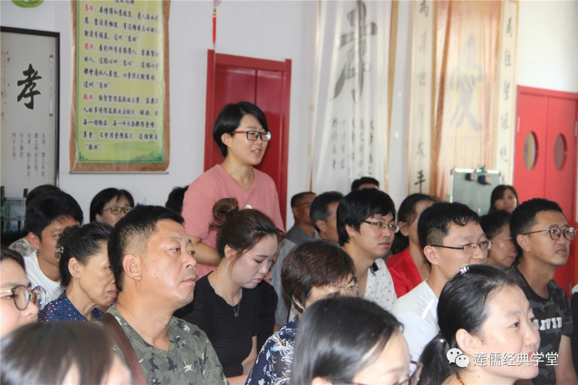 学生与家长在老师的带领下向夫子像行礼,以示对师长的礼敬。