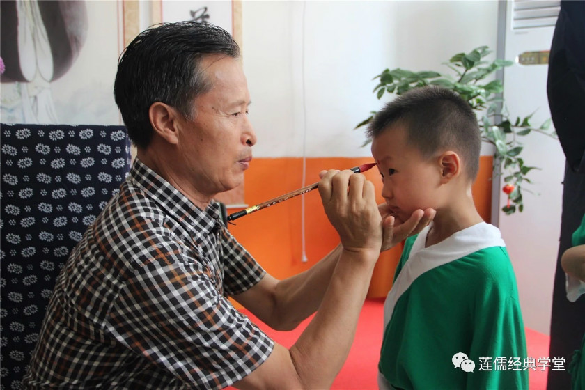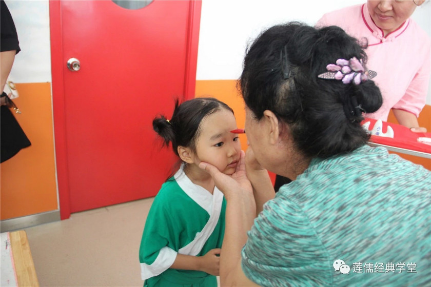老师们手捧朱砂,由德高望重的长者在孩子们的额头中间点上红痣,“痣”同“智”,意为开启智慧,祝福孩子从此眼明心亮,智慧开启。
