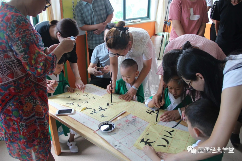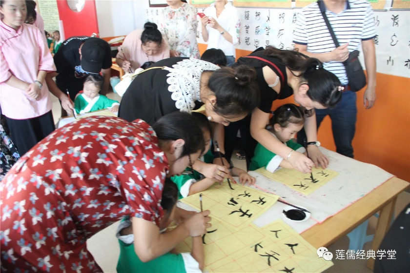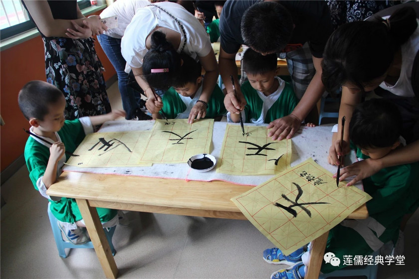 由张先生用毛笔演示书写楷体“人”字,而后孩子提笔模仿,寓意从此做个顶天立地、堂堂正正的人!其中第一笔很重要,要把天地人父母都要写进去,先写一撇在写一捺是“人”、指的是自己,意指要做一个仁爱的人,再写“大”、是母亲,再添一笔写“天”,是父亲。天有不测风云,随时会发脾气,但是承载父亲脾气的,只有母亲,是地,所以地大托天,因此厚德载物,而真正支撑这个家的是家里的“小人”,所以小朋友是家里的栋梁!
