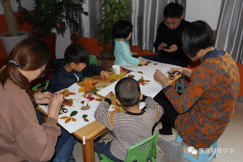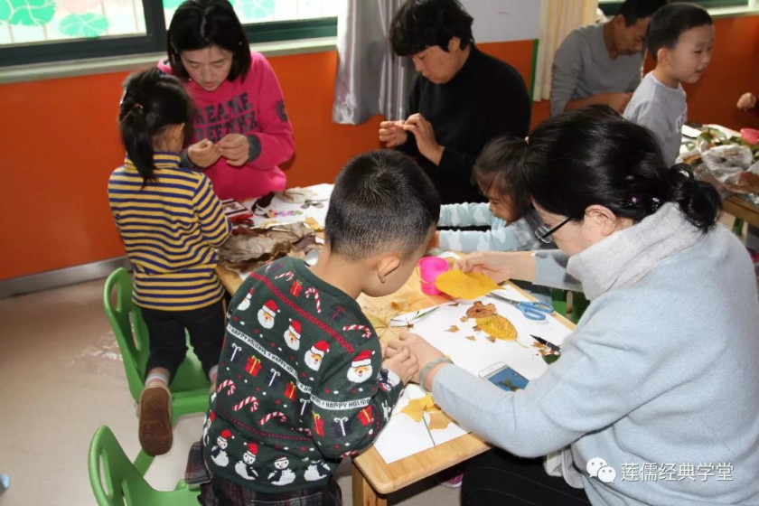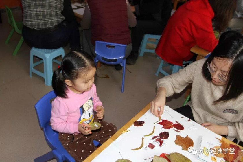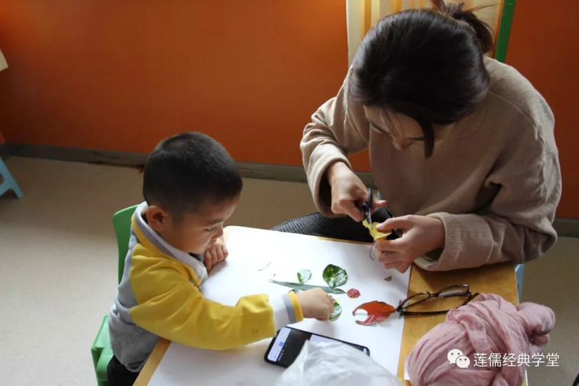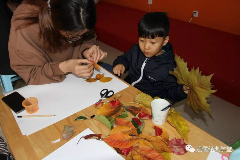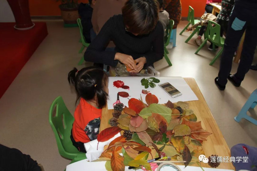 手工制作中,孩子们将自己与父母一起收集到的树叶,合作完成一幅作品送给陪伴我们成长的长辈!