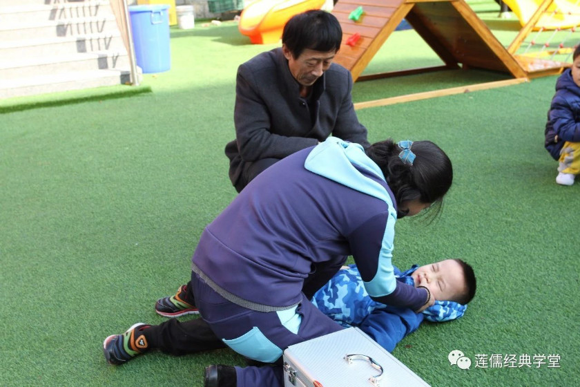 到达户外指定安全地点,校医对受伤幼儿实施抢救工作