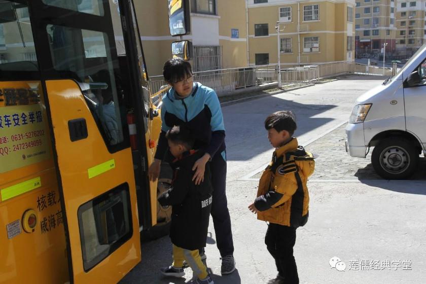 校车老师带领幼儿排队上车。