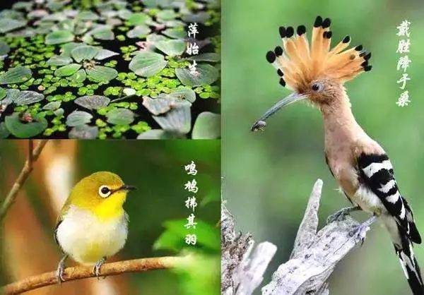 三侯戴胜降于桑:再五日,“戴胜降于桑”。萍水始相逢。萍,水草,与水相平,”戴胜”头顶有长毛,又称鸡冠鸟,此时落于桑树,蚕将生于侯。